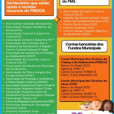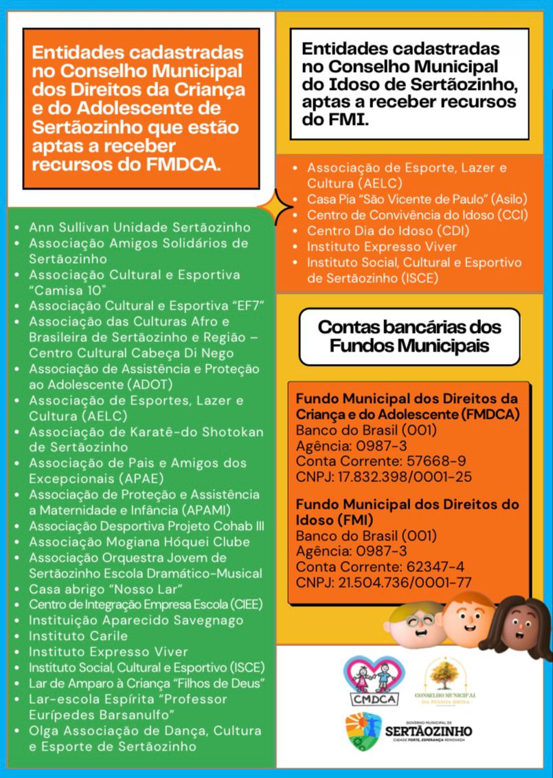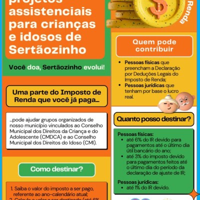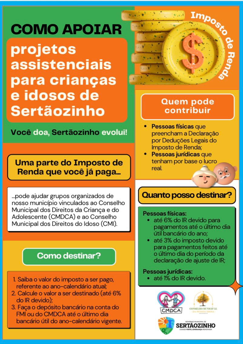 Até 31 de dezembro, pessoas físicas e empresas podem destinar parte do Imposto de Renda (IR) devido aos Fundos Municipais dos Direitos da Criança e do Adolescente e da Pessoa Idosa, apoiando projetos e entidades locais que atendem públicos em situação de vulnerabilidade.